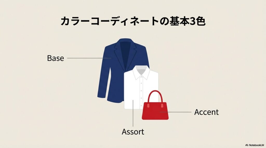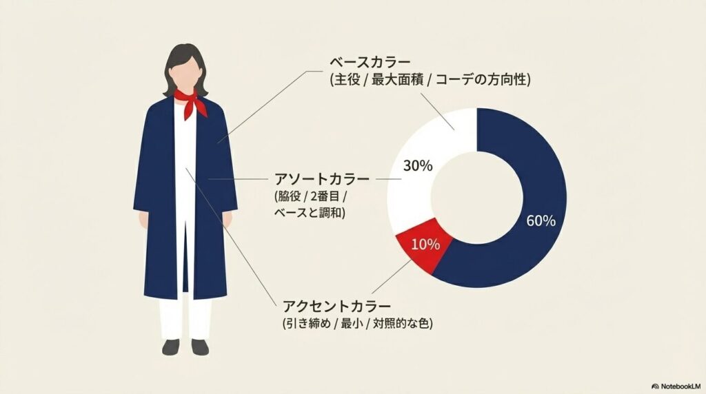 ファッションの配色を考えるとき、まずこの3色の役割を理解することが出発点です。