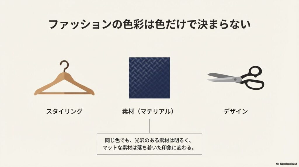 • ファッションの色彩はスタイリング・素材・デザインの3要素で総合的に考える