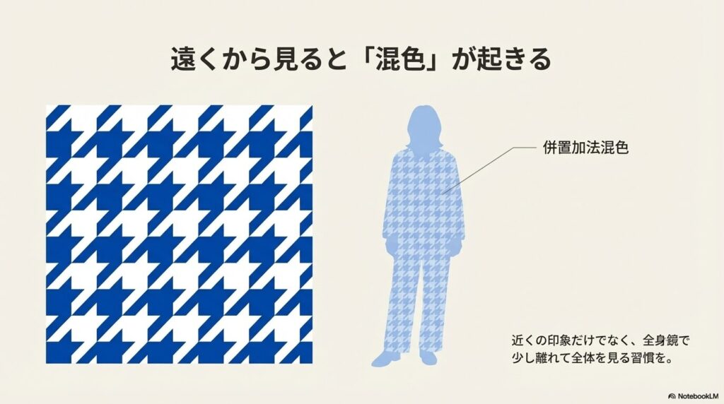 スタイリングを遠くから見ると、複数の色が混ざって見える現象が起きやすくなります。これは加法混色(併置加法混色)の原理です。