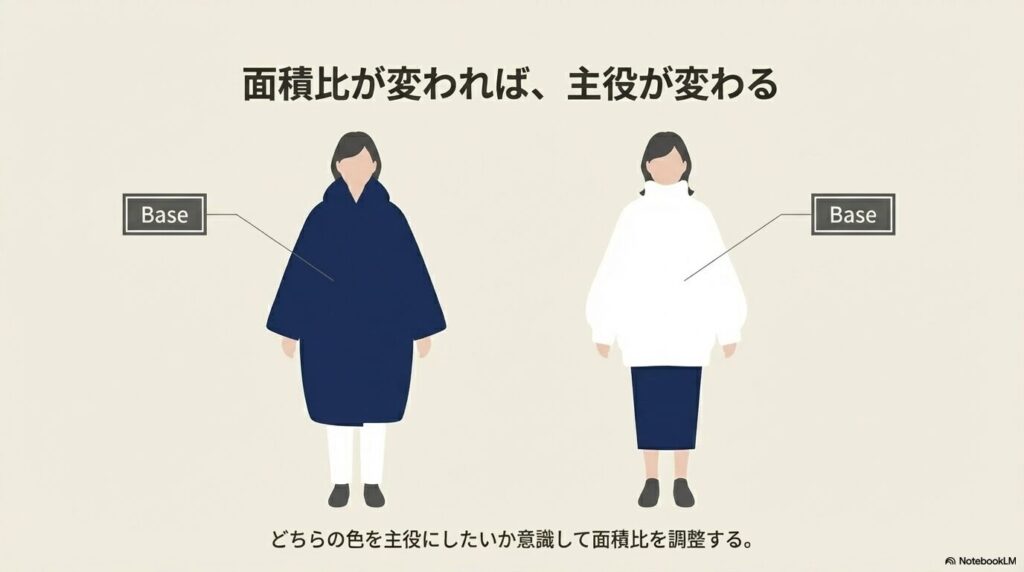 面積が大きい側の色がベースカラーになりやすいため、「どちらの色を主役にしたいか」を意識して面積比を調整することが大切です。同じ2色でも、面積比が変わるだけでまったく異なる印象のコーディネートになります。