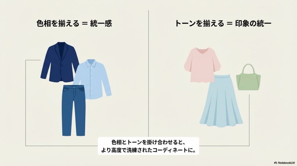 色相とトーンを両方意識することで、より洗練されたコーディネートが作れます。