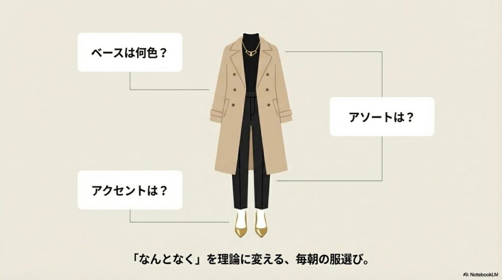 毎朝のコーディネートを「ベースは何色?アソートは?アクセントは?」という視点で考えるだけで、選ぶ理由が生まれてきます。管理人も今日から実践してみます。