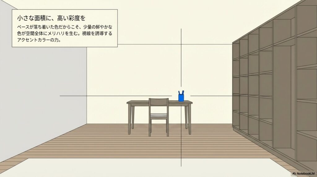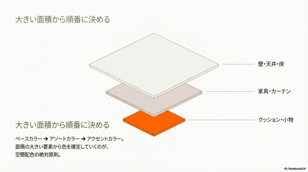 この考え方は、前回のファッション編で学んだ「ベースカラー→アソートカラー→アクセントカラー」と同じ流れです。面積の大きいものから色を決めていくという原則は、ファッションもインテリアも共通しています。