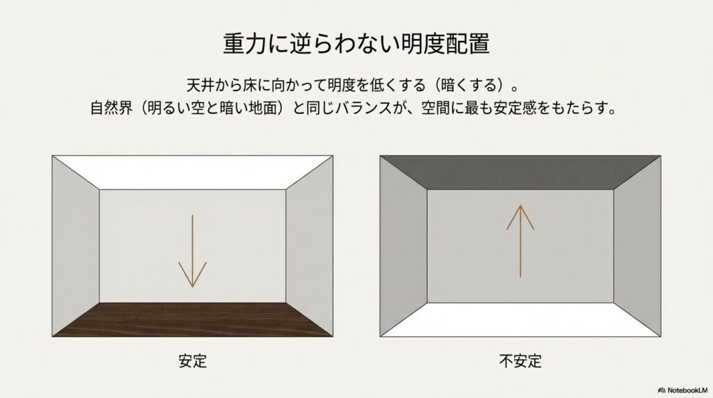 天井→壁→床の順に明度を低くしていくと、室内の重心が下にくるため、バランスの良い安定した配色になります。これは「上が軽く、下が重い」という自然界の安定感(空は明るく、地面は暗い)と同じ原理です。