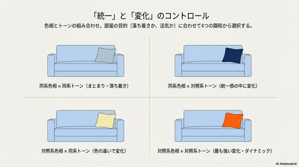 インテリアの配色調和には「統一」と「変化」の考え方があります。色相とトーンの組み合わせ方によって、4つのパターンに分類できます。