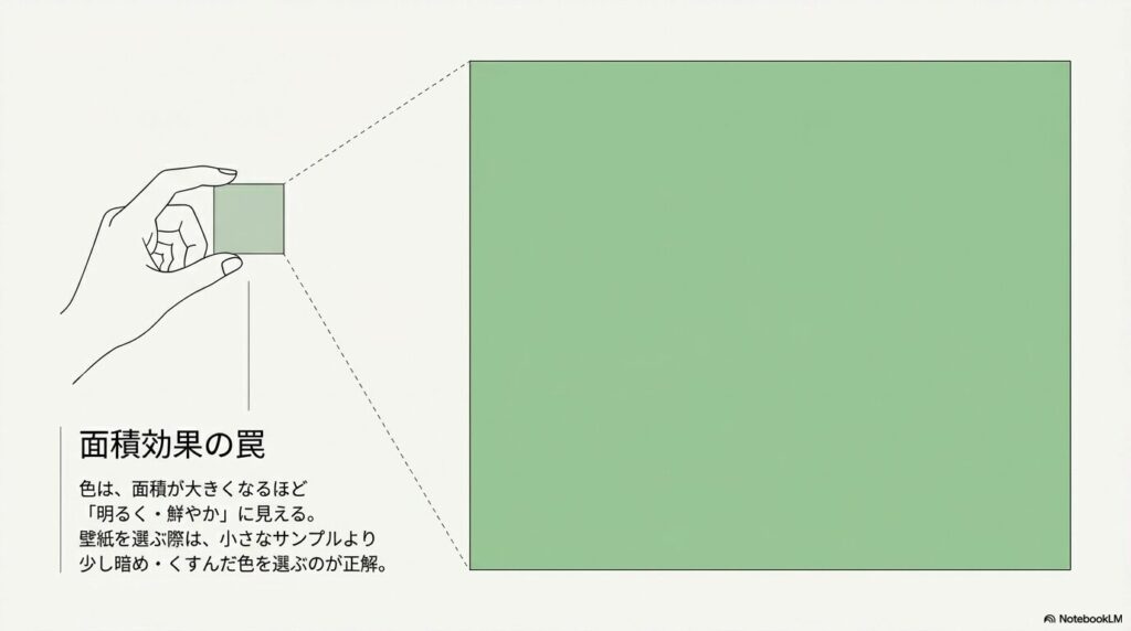 面積効果は、小さな色票で選んだ色が実際の壁に使うと明るく鮮やかに見える現象です。インテリアの色選びでは、この変化を考慮して少し控えめな色を選ぶことがポイントになります。