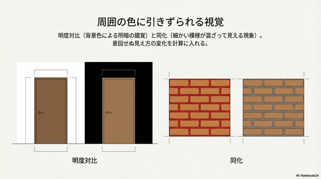 例として、レンガの壁では一個一個のレンガをつなげている目地部分の色が影響して同化が起こります。目地が赤い場合はレンガ全体が赤みがかって見え、目地がグレーの場合はくすんだ印象に変わります。インテリアでは模様のあるエレメントも多いため、こうした同化現象が意図せず生まれることがあります。