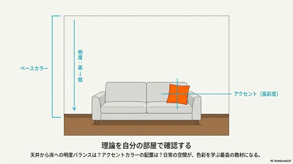自分の部屋を「天井→壁→床の明度はどうなっている?アクセントカラーはどこにある?」という視点で眺めてみてください。テキストの内容が体験として定着します。管理人も引き続き自室を教材にして勉強を続けます。