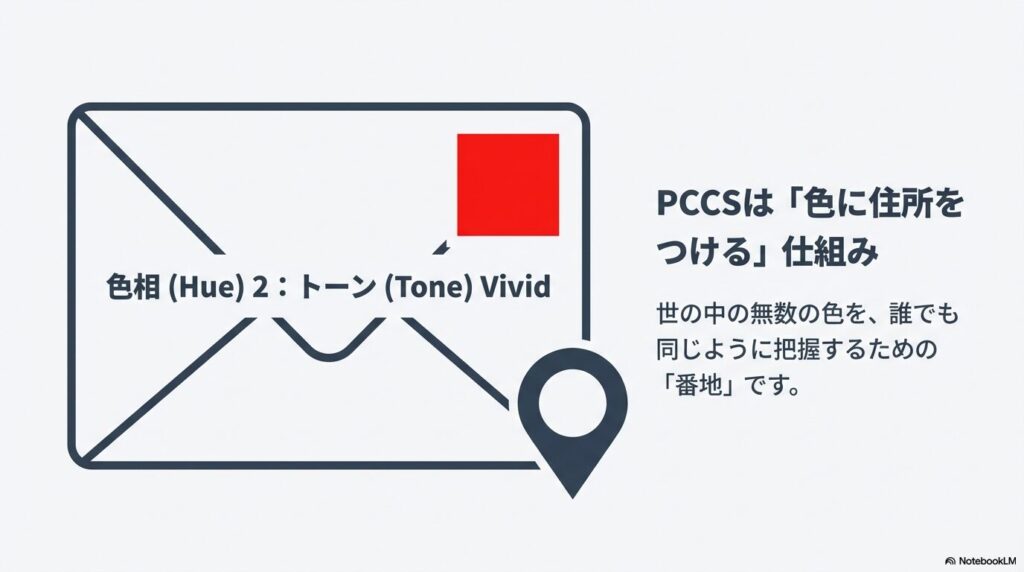 - PCCSとは色を色相(ヒュー)とトーンの2軸で整理する「色の住所システム」