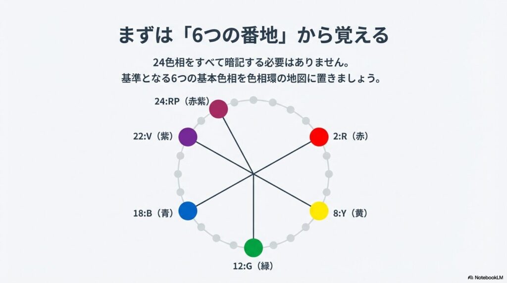 - 色相は24段階。まず6つの基本色相の番号から覚えると全体が把握しやすい