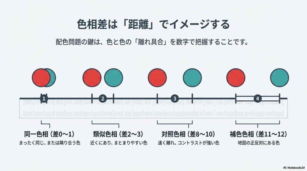 「差が12=補色」という数字だけ先に覚えておくと、問題を解くときにとても役立ちます。 (参考:公益社団法人 色彩検定協会)