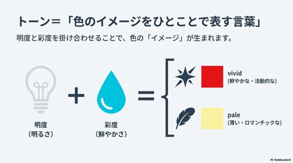PCCSの2つ目の軸は「トーン」です。明度(明るさ)と彩度(鮮やかさ)を組み合わせた概念です。
