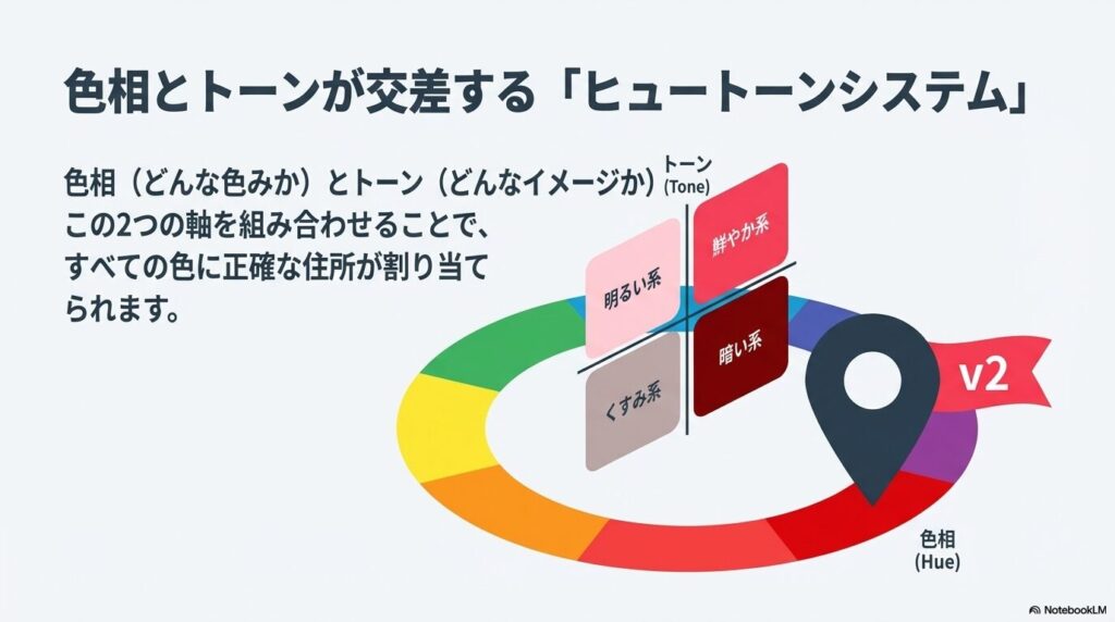 難しく聞こえますが、やっていることはシンプルです。世の中には無数の色がありますが、それを「どんな色みか(色相)」と「明るさと鮮やかさの組み合わせ(トーン)」の2軸で整理している。つまり色に住所をつける仕組みです。