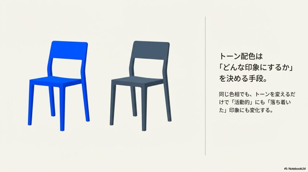 色相配色が「何の色みを使うか」を決める手段なら、トーン配色は「どんな印象にするか」を決める手段です。同じ色相でもトーンを変えるだけで、落ち着いた印象にも活動的な印象にもなります。