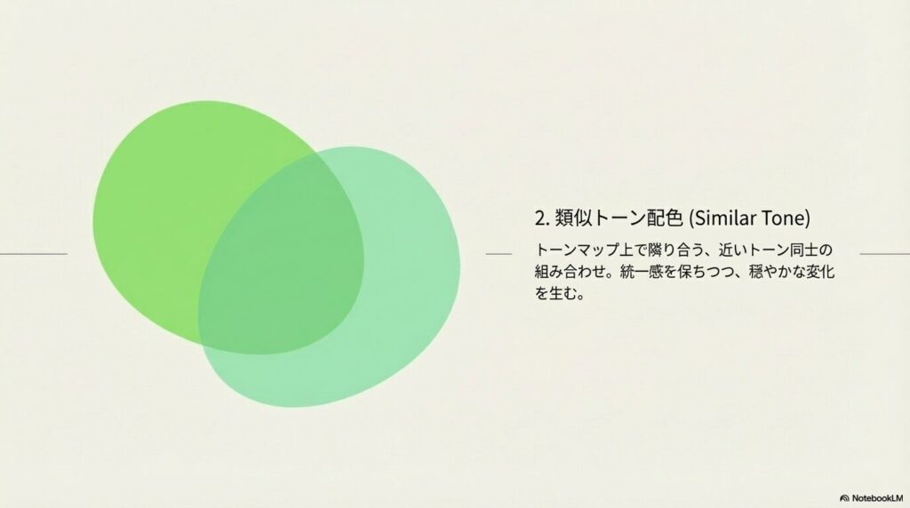 • 類似トーン配色:近いトーン同士。穏やかな変化・まとまりあり