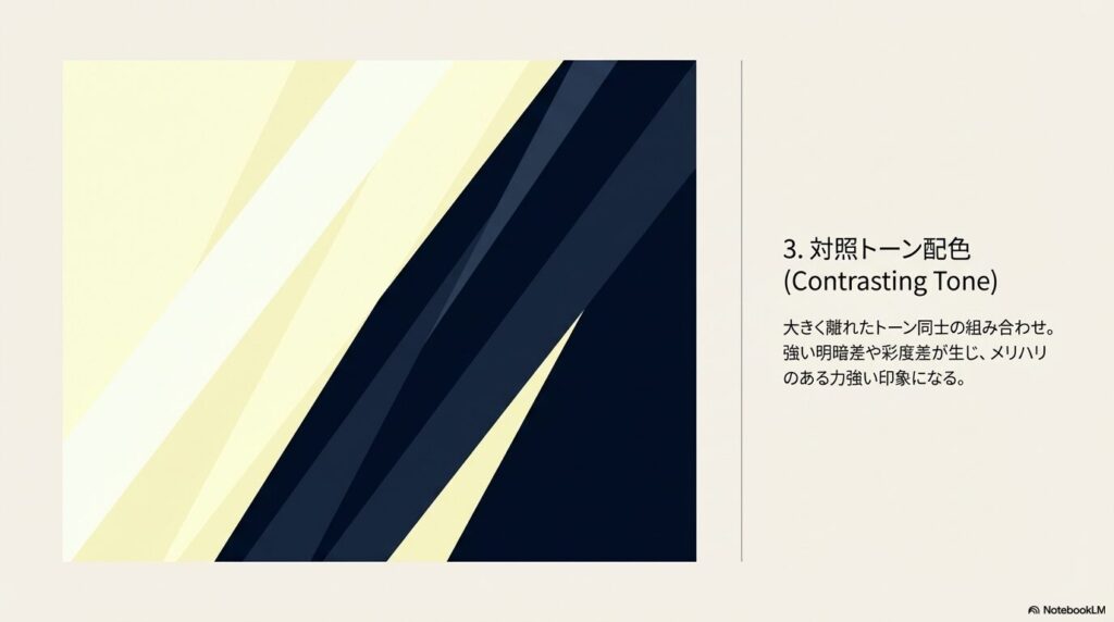 • 対照トーン配色:離れたトーン同士。コントラスト強・メリハリが出る