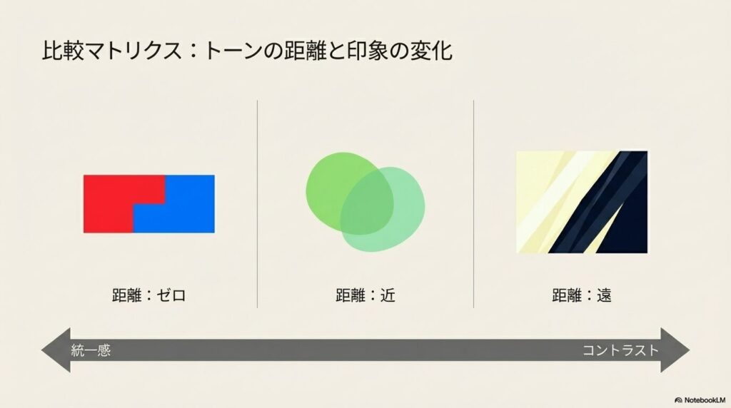 • トーン配色は「どんな印象にするか」を決める手段。距離が近いほど統一感、遠いほどコントラスト