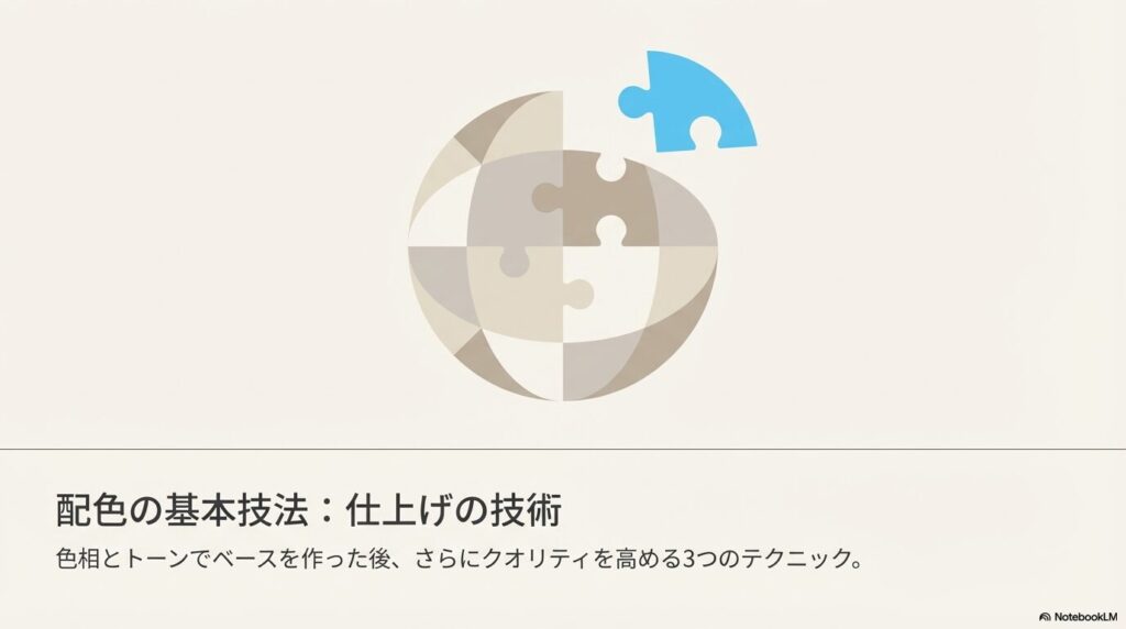 配色の基本技法は、色相配色やトーン配色に加えて使う「仕上げの技術」です。3つとも日常のデザインやファッションでよく見かけるものなので、身の回りの例と結びつけて覚えると定着しやすいです。