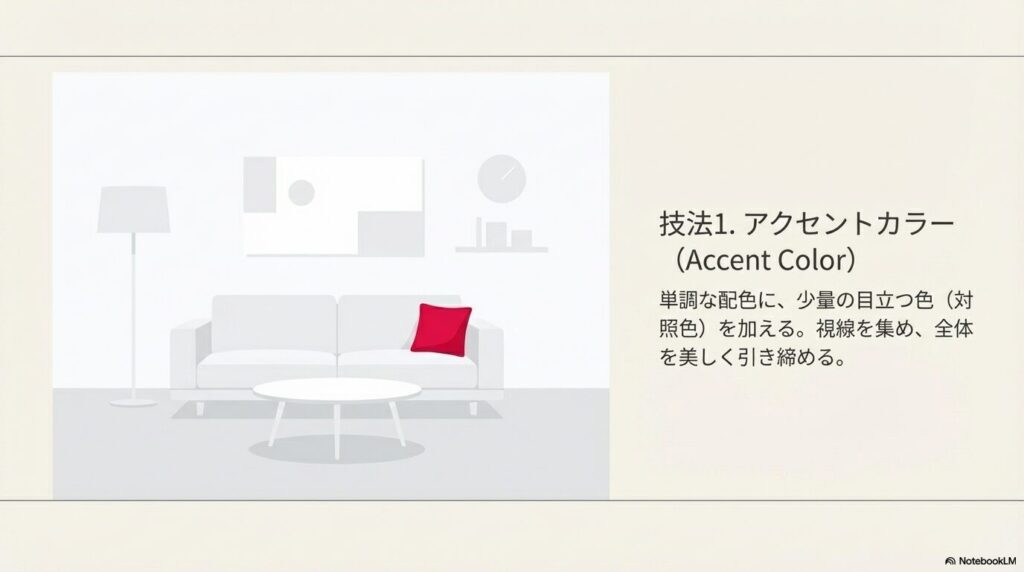 アクセントカラーを入れることで、全体を引き締めたり、特定の部分に視線を集めたりする効果があります。使用面積は少量がポイントです。大きくなりすぎるとアクセントではなくメインカラーになってしまいます。