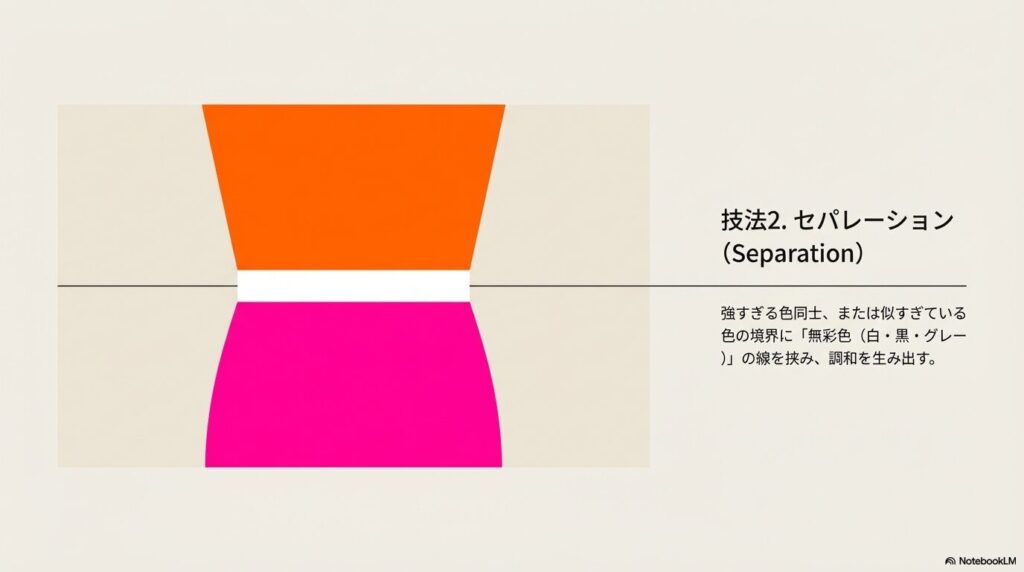 • セパレーションは色の間に無彩色を挿入してメリハリをつけるか対比を和らげる技法