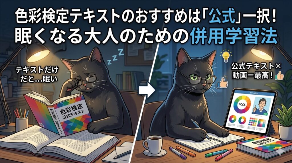 色彩検定のテキスト、どれを買えばいいか迷っていませんか?結論から言います。公式テキスト一択です。 でも……公式テキストって、開いて3分で猛烈な睡魔に襲われませんか?(笑) この記事では、テキスト選びで迷わないための結論と、公式テキストを「眠く... -